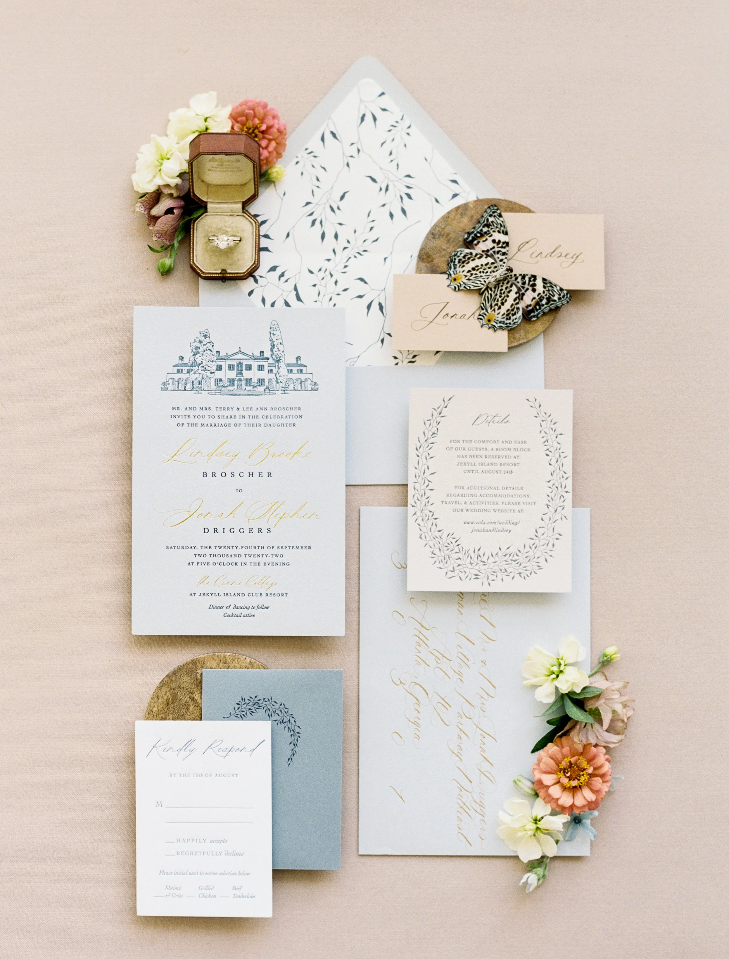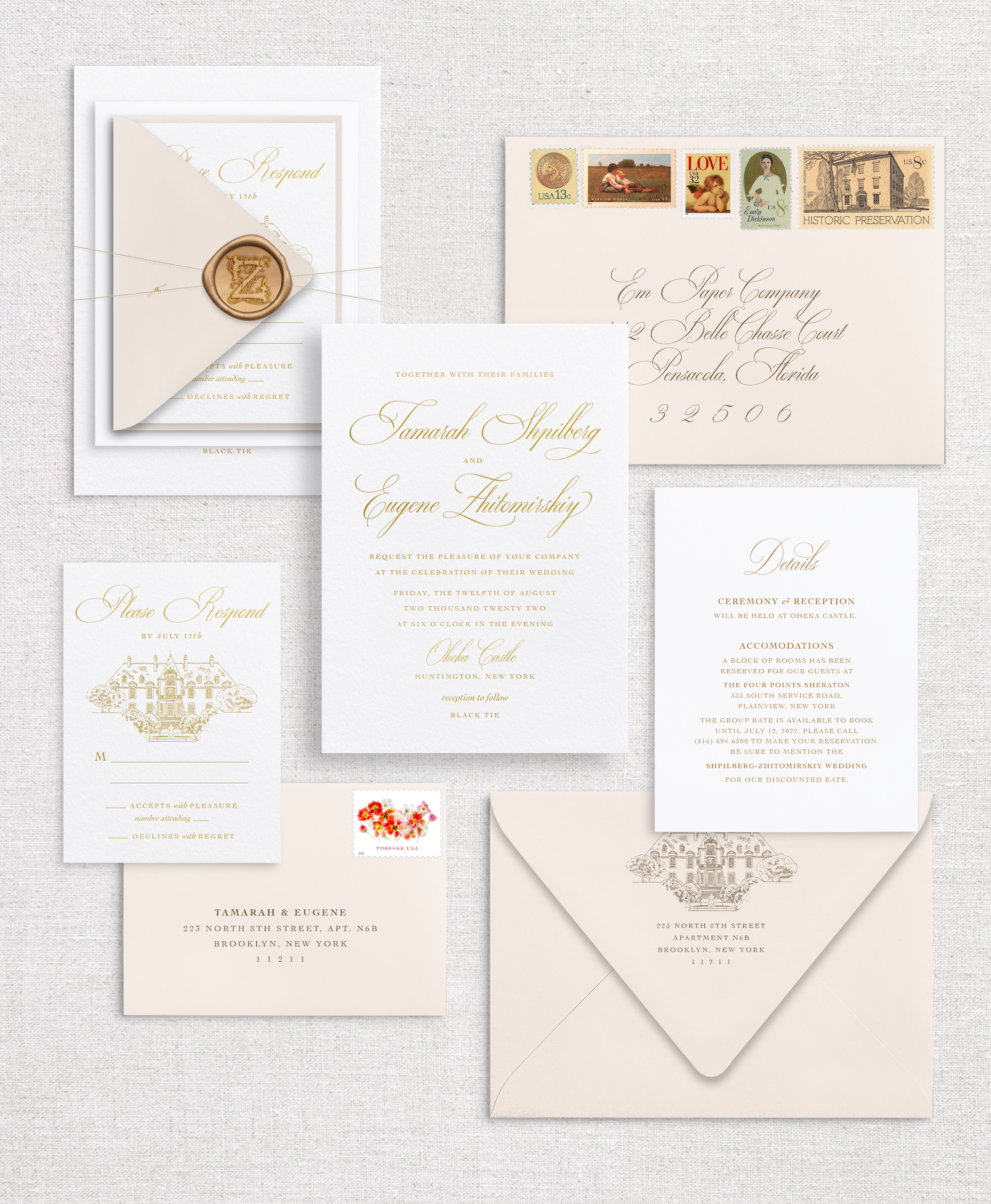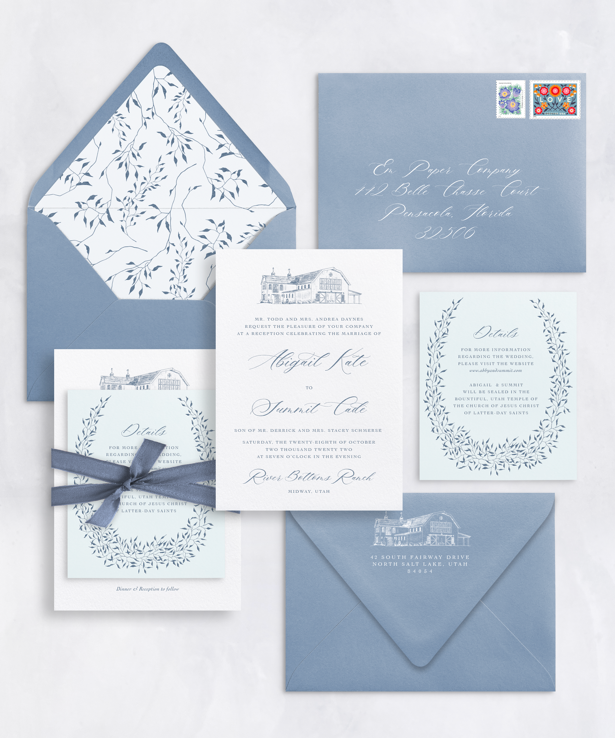 Reminiscent of the old world, the Parlour suite features elegant calligraphy and organic vines. It is traditional yet organic. The custom venue illustration adorning this suite is the perfect way to tie in the couple’s wedding venue making this suite unique to their big day.